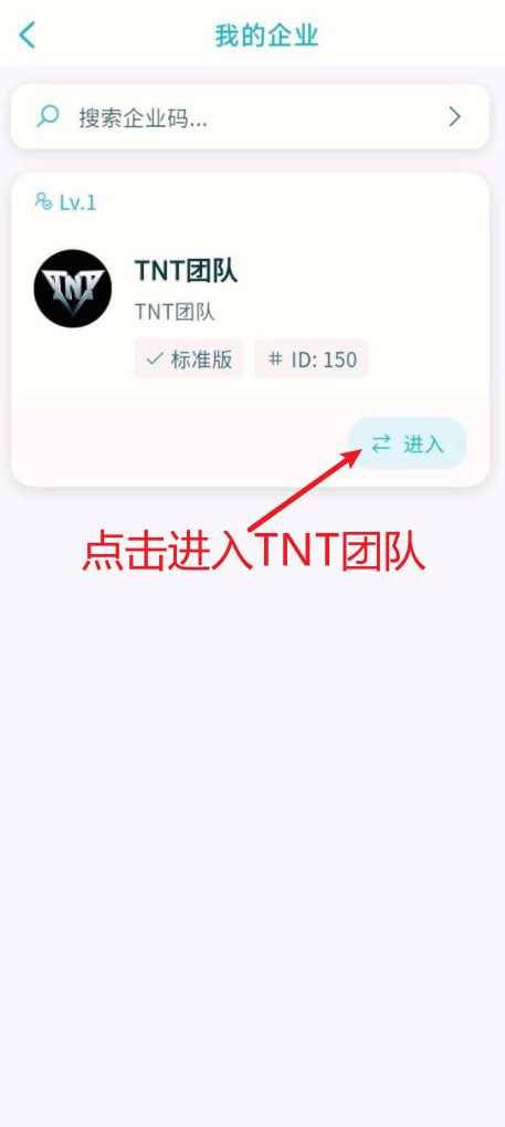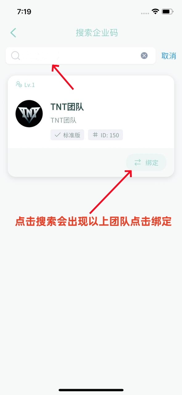4.搜索框输入企业码【TT079453】搜索TNT团队点击绑定